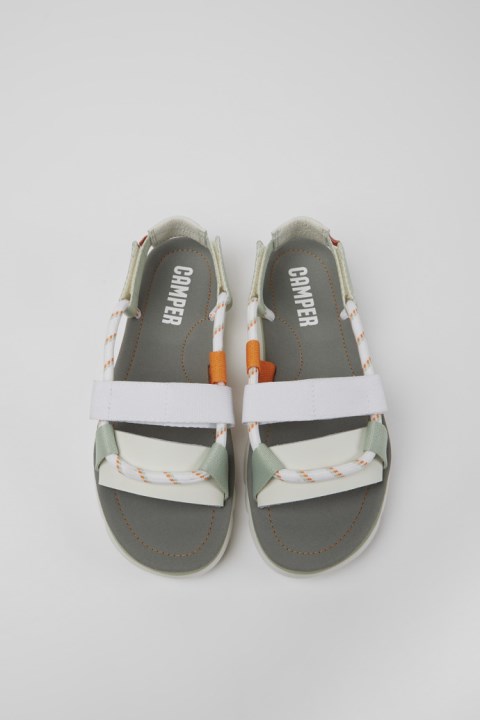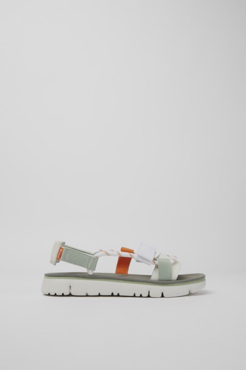 XL EXTRALIGHT® Organix™ Dış Tabanlı (%30 Biyo-bazlı şeker Kamışı) Beyaz, Yeşil Ve Turuncu Deri Ve Geri Dönüştürülmüş PET Dokuma Kadın Sandaleti. İngilizce "tırtıl" Anlamına Gelen Oruga Kadın Sandaletlerimiz Esnek, Hafif Tabanlar Ve şehirli Bir Yaz Görünümü Sunar.