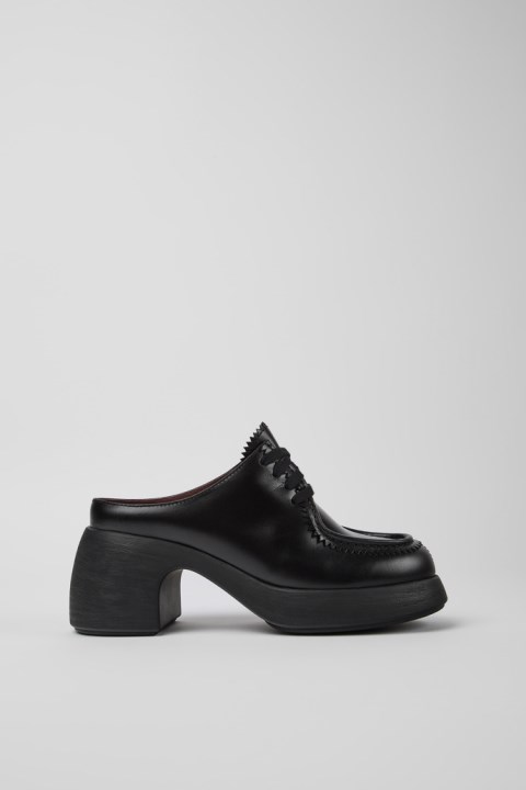 EVA Tabanlı Ve PU Dış Tabanlı Siyah Deri Kadın Terlikleri. Thelma, Kıvrımlı Bir Topuk Ile Zarif Bir Hacim Karışımına Sahiptir.