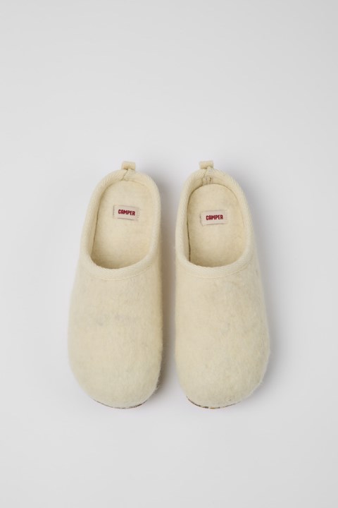 EVA Tabanlı Ve Kauçuk Dış Tabanlı Bej Yün Kadın Terlikleri. İkonik Wabi Terliklerimiz Japon Minimalizminden İlham Almıştır. Bileşenleri Ve üretim Süreçlerini Minimumda Tutma Fikriyle üretilen Bu Terlikler, Yumuşak Yastıklama Ve Rahatlık Hissi Ile İlk çıkışlarından Yirmi Yılı Aşkın Bir Süredir İç Mekan Konforunu Yeniden Tanımlamaya Devam Ediyor.